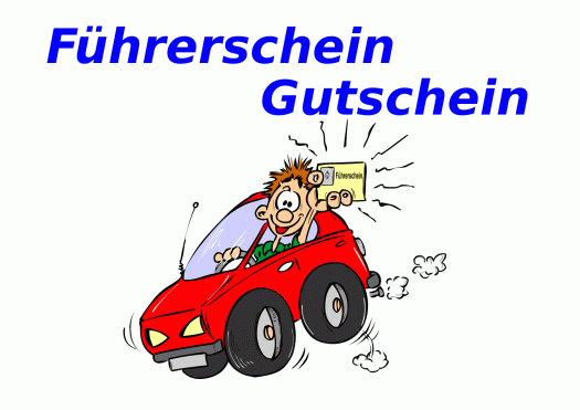 Das Motiv des Geschenkgutscheins ist jemand, der aus dem Fahrerfenster seines Auto schaut und sich mächtig über die gerade bestandene Führerscheinprüfung freut. Stolz reckt er uns zum Zeichen seines Erfolges den frisch erworbenen "Lappen" entgegen. Sogar das Auto hüpft da vor Freude.
