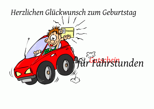 Das Motiv des Geschenkgutscheins ist jemand, der aus dem Fahrerfenster seines Auto schaut und sich mächtig über die gerade bestandene Führerscheinprüfung freut. Stolz reckt er uns zum Zeichen seines Erfolges den frisch erworbenen "Lappen" entgegen. Sogar das Auto hüpft da vor Freude.