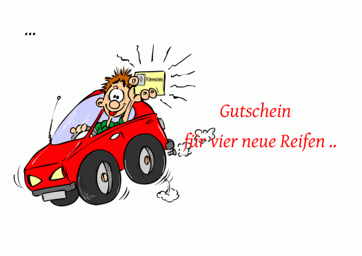 Das Motiv des Geschenkgutscheins ist jemand, der aus dem Fahrerfenster seines Auto schaut und sich mächtig über die gerade bestandene Führerscheinprüfung freut. Stolz reckt er uns zum Zeichen seines Erfolges den frisch erworbenen "Lappen" entgegen. Sogar das Auto hüpft da vor Freude.