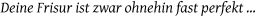 Eine typische Szene im Friseursalon: Der Friseur hat den Kunden schon zum zweiten mal ins Ohr geschnitten. Um diesen abzulenken fragt er: "Nun mein Herr, waren sie eigentlich schon mal bei uns?" Kunde: "Nein, den Arm hab ich im Krieg verloren..."