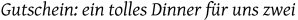 Auch die Einladung sollte was her machen. Bei uns können Sie solche selbst gestalten. Einfach den Einladungs- bzw. Gutscheinvordruck auswählen, die Einladung gestalten und dann als PDF mit höchster Druckqualität ausdrucken. Fertig ist die Einladung. Falls man Lust hat, den geliebten Menschen doch lieber ins Restaurant auszuführen, wäre vielleicht das Anfertigen von einem Restaurant Gutschein die richtige Wahl.