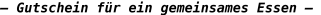 Besondere Menschen verdienen es, von Zeit zu Zeit überrascht zu werden. Ein leckeres Essen erfreut jeden. Nicht umsonst besagt ein bekanntes Sprichwort, dass Liebe durch den Magen geht. Begeistern Sie einen lieben Menschen mit einem Gutschein Essen/Einladung zum Essen. Gemeinsam Essen zu gehen bedeutet gemeinsame Zeit. Mit einem solchen Geschenk liegen Sie beim Partner, bei den Eltern, Freunden oder guten Kollegen richtig.